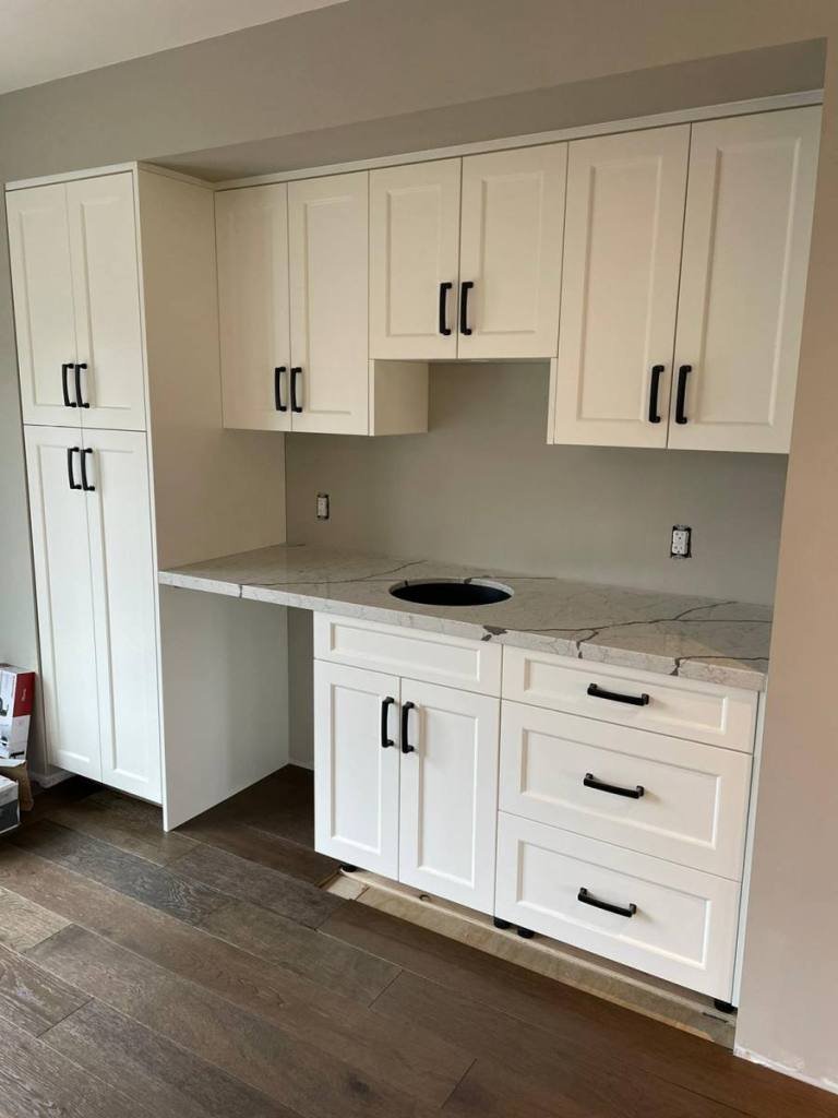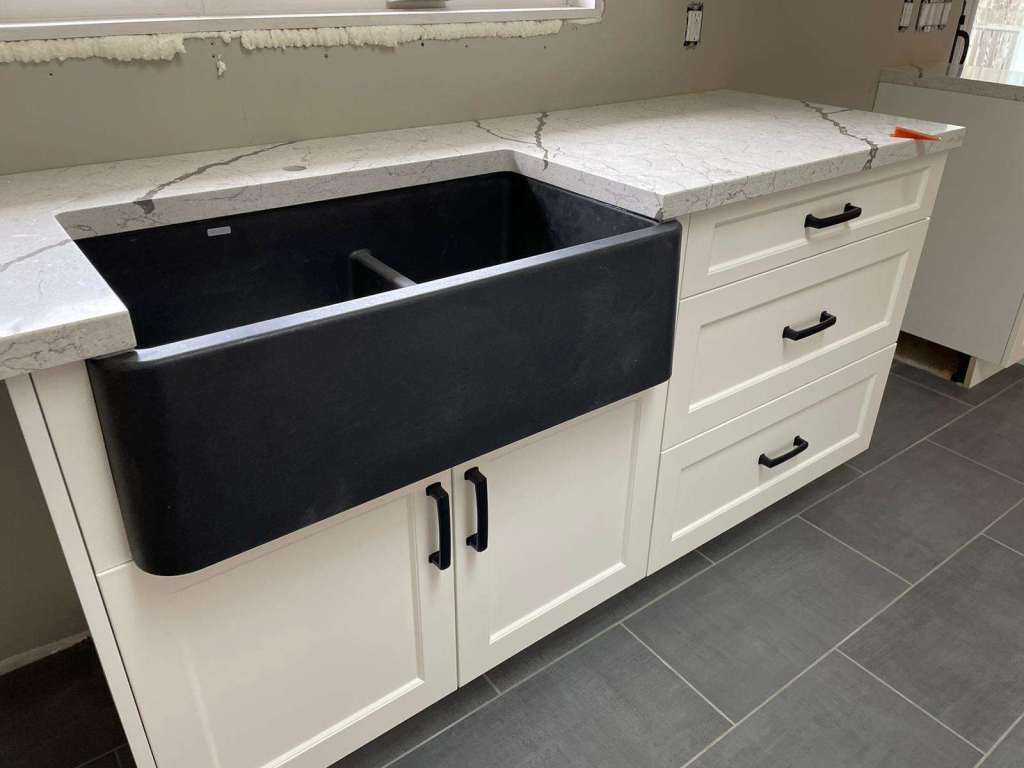 Millwork complete, but renovation in progress! Bold black hardware and farmhouse style sink, really pop on these willow white cabinets.