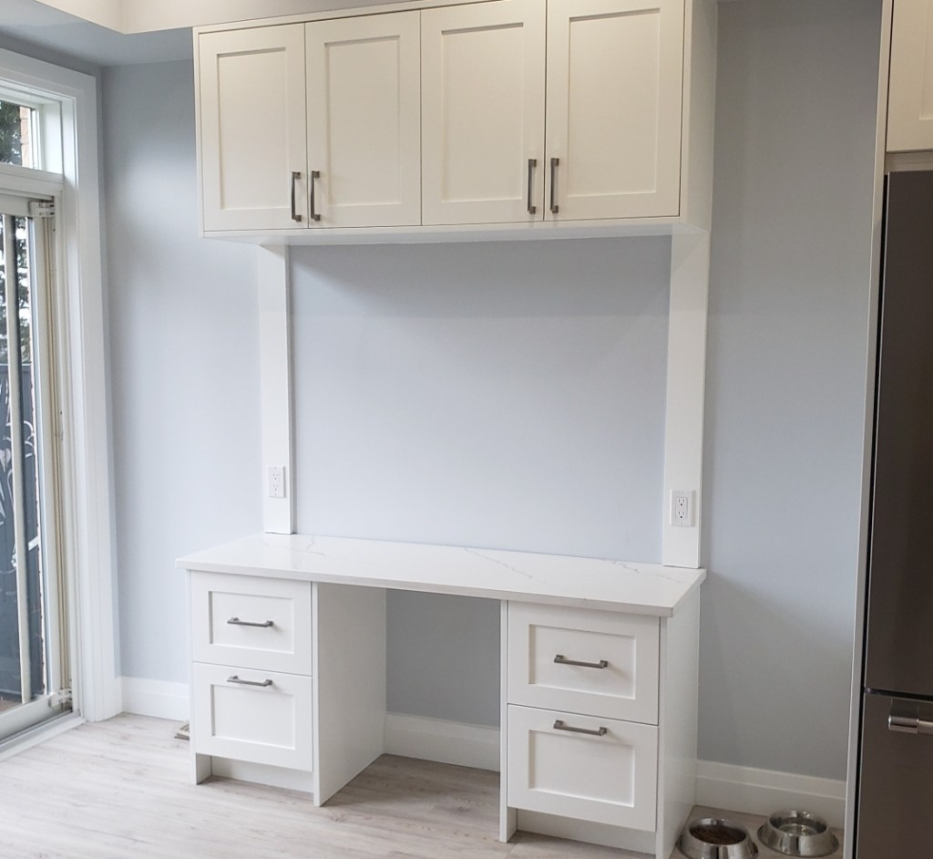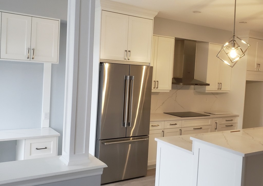 All white shaker style cabinetry is keeping this space looking sleek and clean, while really increasing the functionality of this clients kitchen.