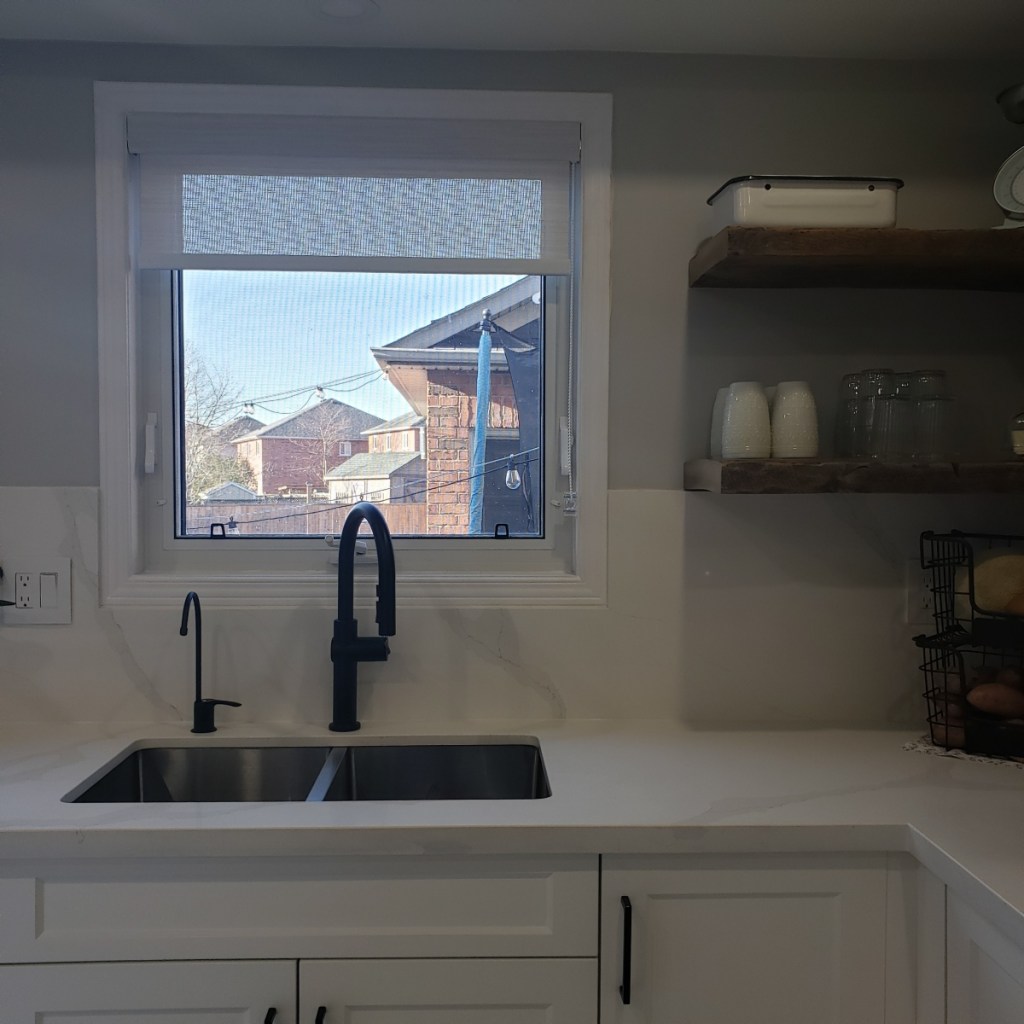 Wood open floating shelving and a matching wood counter top on the island, brings warmth into the space.